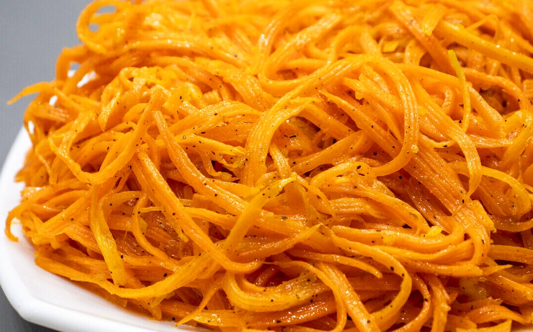 - Рецепт розрахований на 1 кг моркви. Бажано моркву брати довгу. Очищаємо її та натираємо на тертці для корейської моркви. Це найскладніше в даному рецепті, але воно того варте.