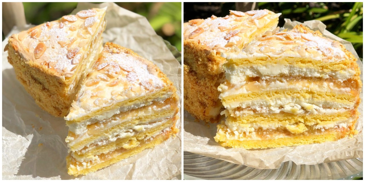 Даємо пляцку просочитися, я залишала на пару годин на столі, кільце знімаємо і обсипаємо боки крихтою, що залишилася від коржів, торт охолоджуємо кілька годин. Присипаємо пудрою. А потім… насолоджуємося неземним смаком, розсипчастим, ніжним, свіжим!