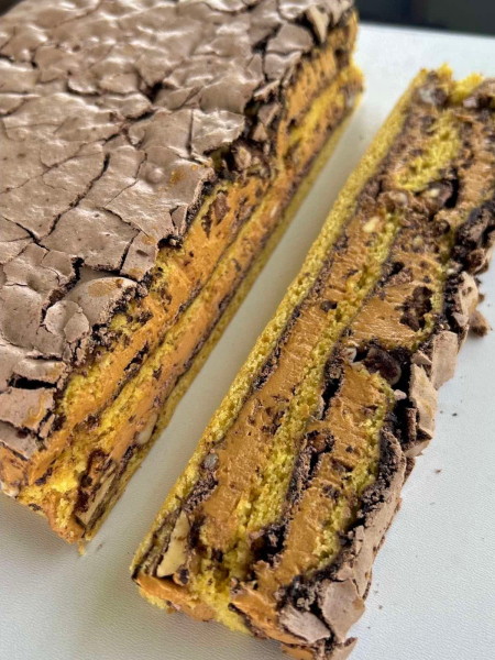 Пляцок складається з пісочних коржів, білково-шоколадної меренги, в середині шоколад і горіхи, я додала ще арахісу жменьку. Перемащений масляний кремом зі згущеним молоком. Це один з найсмачніших.