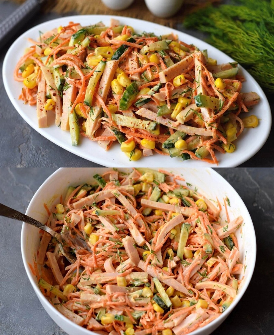 Моркву по-корейськи розріжте на короткі смужки. Моркву можна придбати у магазині або заздалегідь приготувати самостійно. Консервовану кукурудзу процідіть від маринаду. Моркву та кукурудзу додайте до основного складу.