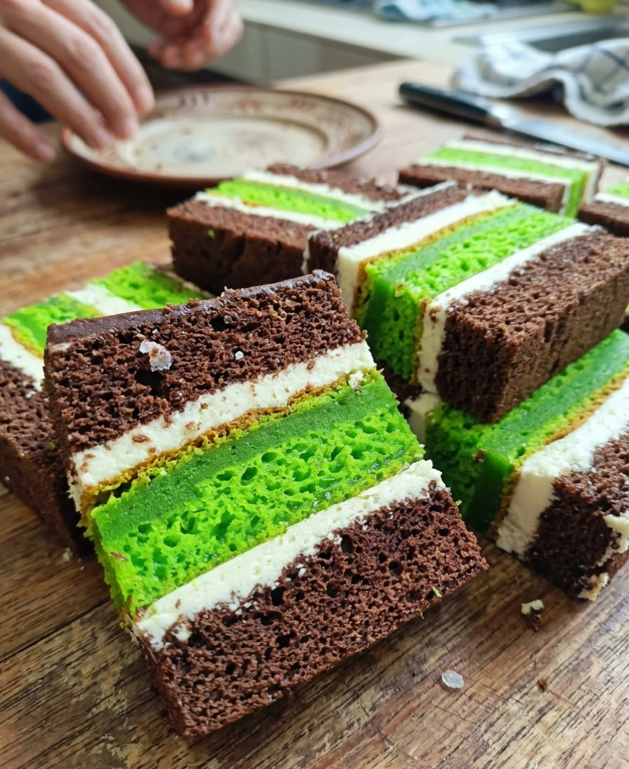 Складаємо пляцок: шоколадний корж – крем – зелений корж – крем – шоколадний корж.