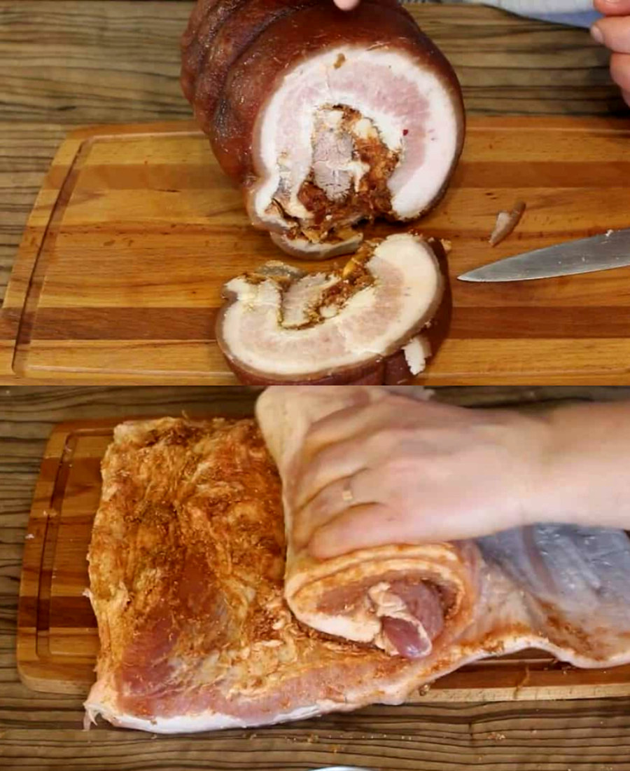 Смачний рулет зі свинної підчеревини, варений в цибульному лушпинні. У міру солоний з м’якою шкіркою, з ароматом часнику і спецій.