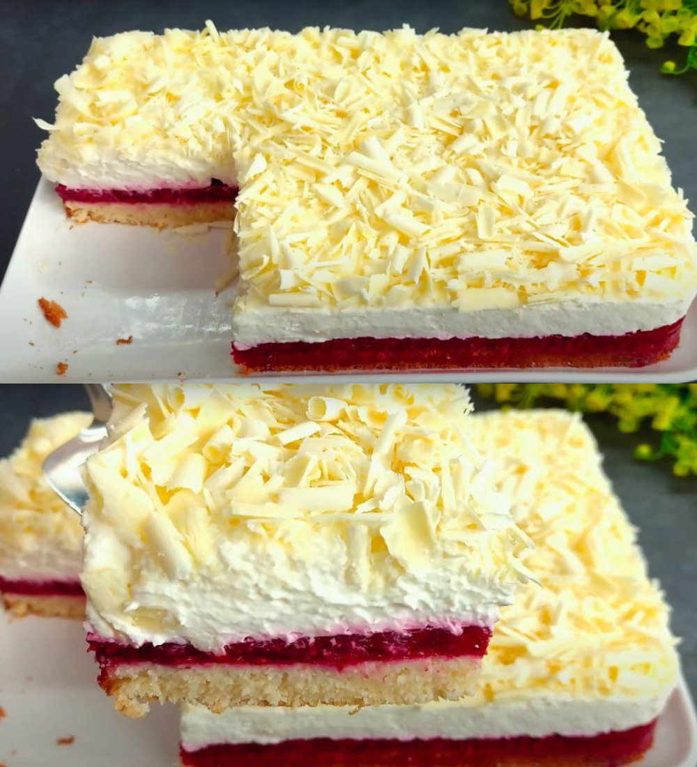 Для крему збиваємо вершки з цукром, вершковим сиром та кокосовою стружкою. Викладаємо отриманий крем на малиновий шар рівномірно.