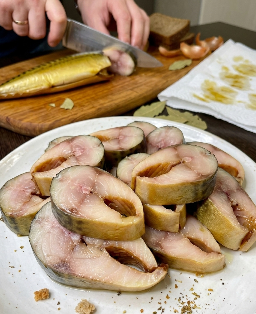 Остуджуємо, проціджуємо та заливаємо скумбрію. На годину залишаємо за кімнатної температури.