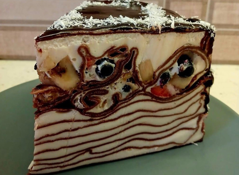 Змащуємо верхній млинець і на нього викладаємо по колу скручені млинці з ягодами, фруктами. Заливаємо йогуртом, що залишився.